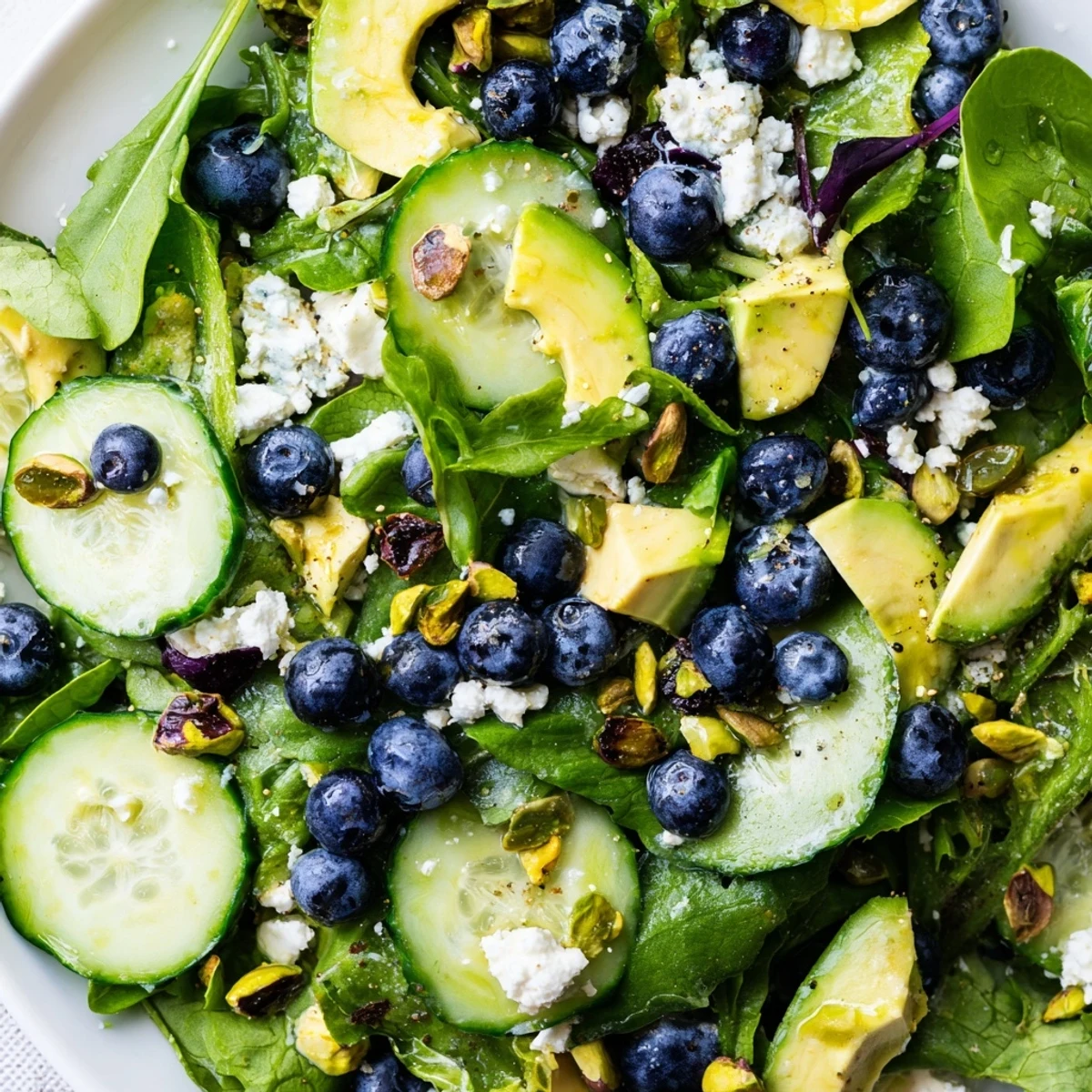 The first time I made this salad was during an unreasonably hot June, when my tiny apartment kitchen felt like a sauna and cooking anything over heat was out of the question. I had a pint of blueberries that were starting to soften and a bag of pistachios leftover from a failed baking experiment, so I threw everything into a bowl without much thought. My roommate walked in, took one look at the vibrant colors, and said it looked like something from a restaurant menu. Now it's my go-to when I want something that feels special but requires zero actual cooking.