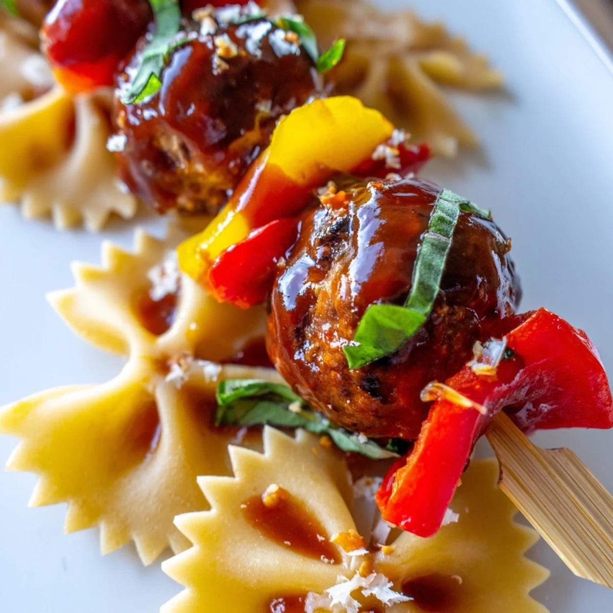 These festive skewers bring together classic Italian-American flavors in a handheld format perfect for entertaining. Tender farfalle pasta pairs beautifully with cocktail-sized meatballs coated in a sweet and savory glaze, while crisp bell peppers and juicy grape tomatoes add fresh crunch and vibrant color.