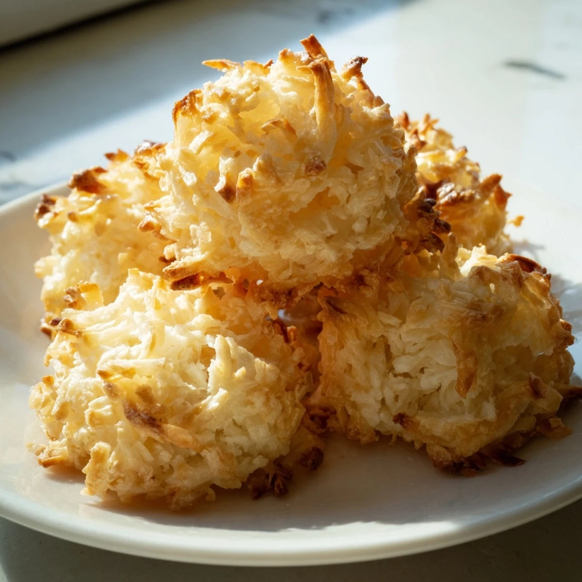 The combination of sweetened shredded coconut and egg whites creates that signature chewy texture. The moisture from the egg whites keeps the interior soft while the edges become golden and crispy during baking.