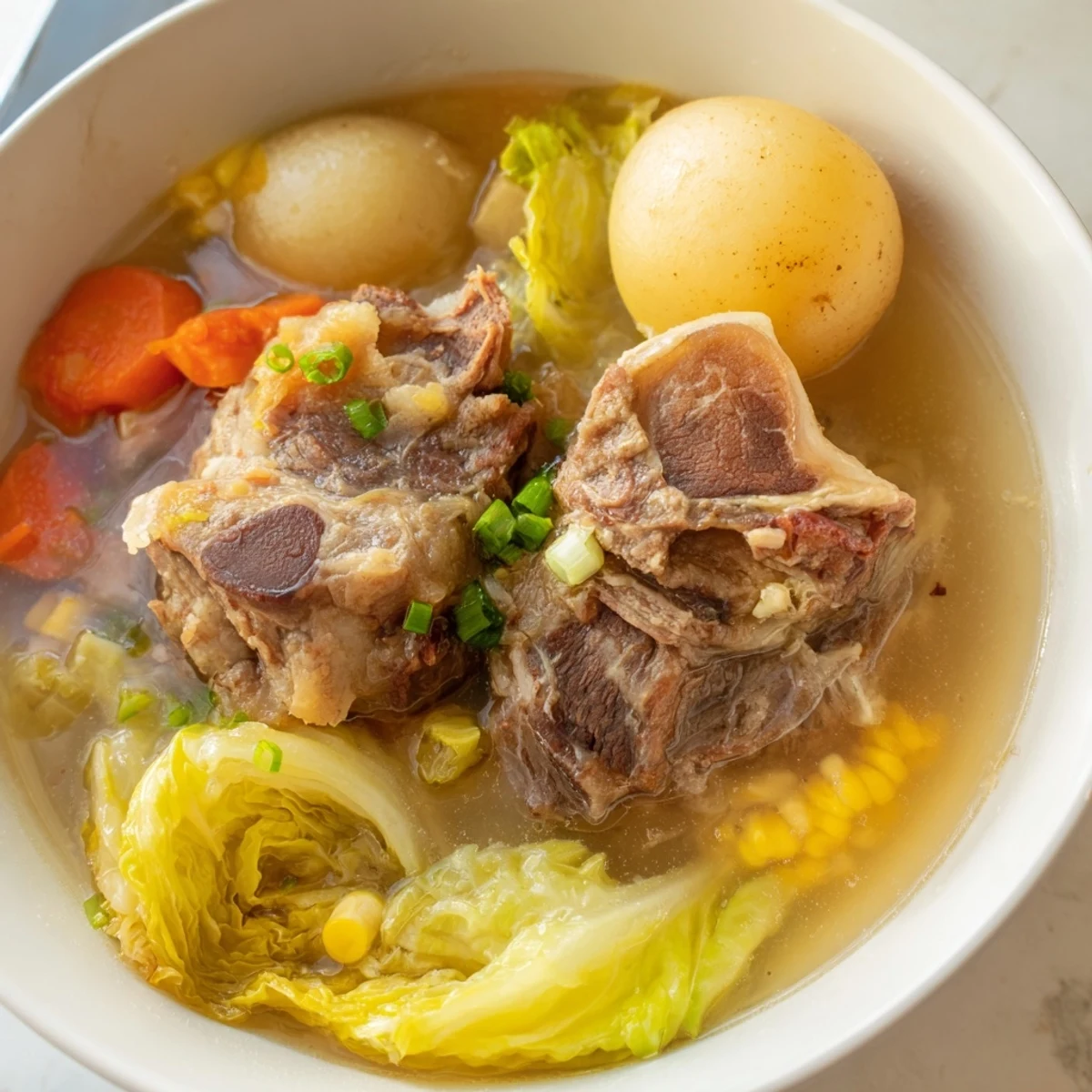 This traditional Filipino soup transforms beef shank and bone marrow into a deeply nourishing clear broth simmered for hours. The slow cooking process extracts maximum flavor from the bones, creating a rich base that's perfectly balanced with fresh vegetables like corn, potatoes, napa cabbage, and green beans.