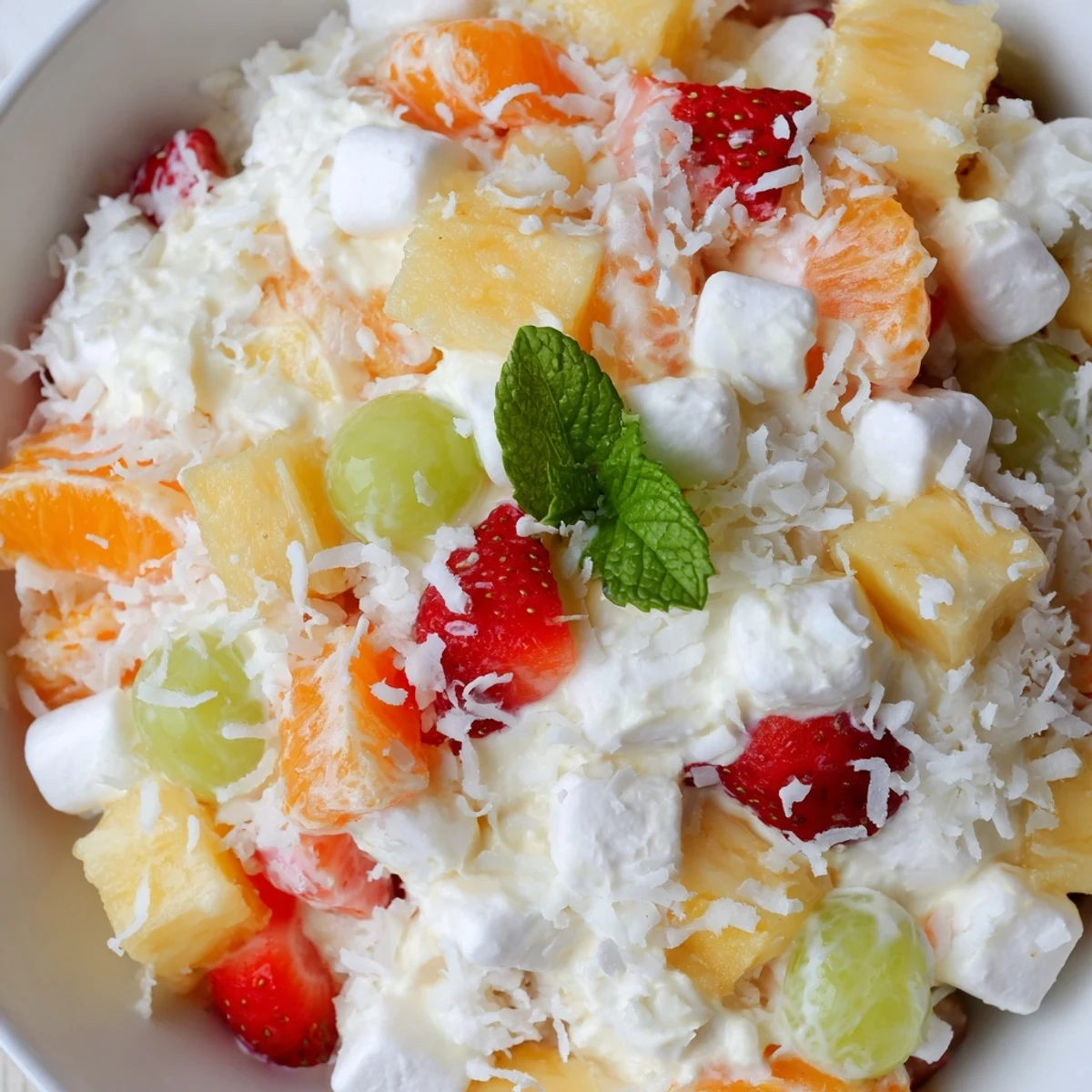 This vibrant Hawaiian-inspired dessert features a velvety cream cheese and vanilla cream base folded with sweet pineapple chunks, fresh strawberries, mandarin oranges, green grapes, and sliced bananas. The creamy dressing coats each piece of fruit, creating a luscious tropical medley that's perfect for potlucks, barbecues, or summer entertaining. Optional marshmallows add a delightful texture contrast, while toasted coconut and mint make beautiful garnishes. Best served chilled after refrigerating for at least one hour to let the flavors meld together beautifully.