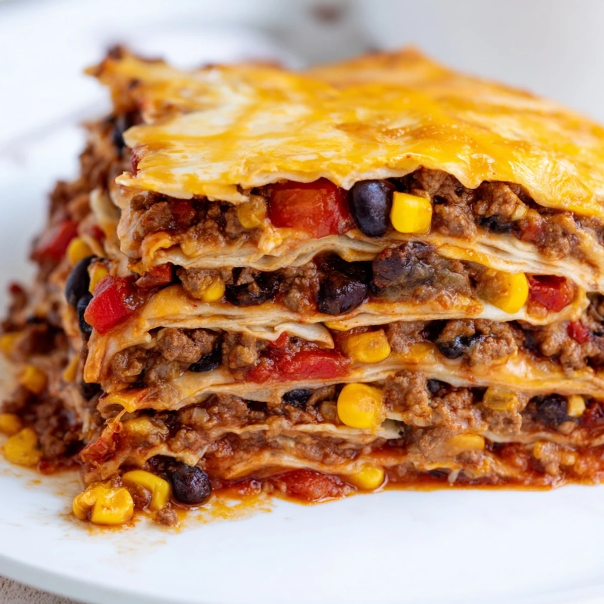 This hearty Mexican-American casserole transforms classic lasagna concepts with authentic Tex-Mex ingredients. Flour tortillas replace pasta sheets, while a savory mixture of browned ground beef, black beans, sweet corn, and diced tomatoes creates layers of robust flavor. The taco seasoning blend brings authentic southwestern spices that permeate every bite, while generous amounts of shredded Mexican cheese blend melt into gooey, golden perfection. Baking creates those coveted crispy edges and warm, bubbling center that make this dish impossible to resist. Perfect for feeding a crowd or enjoying leftovers throughout the week.