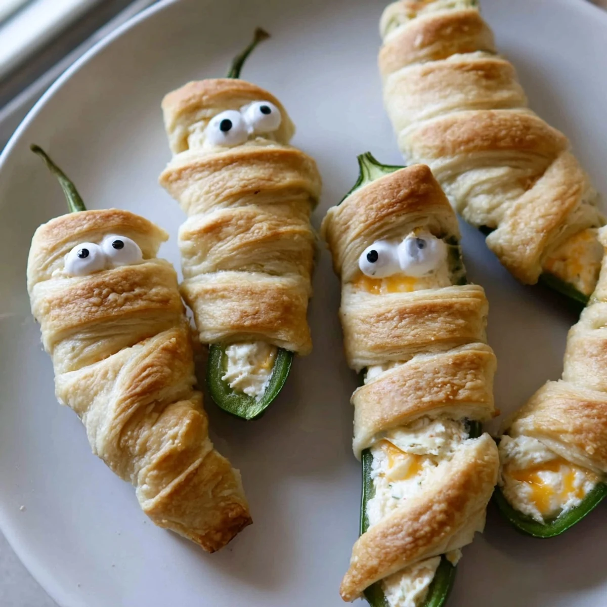These festive Halloween appetizers transform classic jalapeno poppers into adorable mummies. Fresh jalapeño halves get stuffed with a creamy blend of cream cheese, sharp cheddar, garlic, and smoky spices, then wrapped in thin strips of crescent dough to create bandage-like wrappings. After baking until golden and crisp, add candy eyes or olive slices to complete the spooky look. The combination of spicy peppers, rich cheese filling, and buttery pastry creates irresistible flavor layers that disappear quickly at parties.